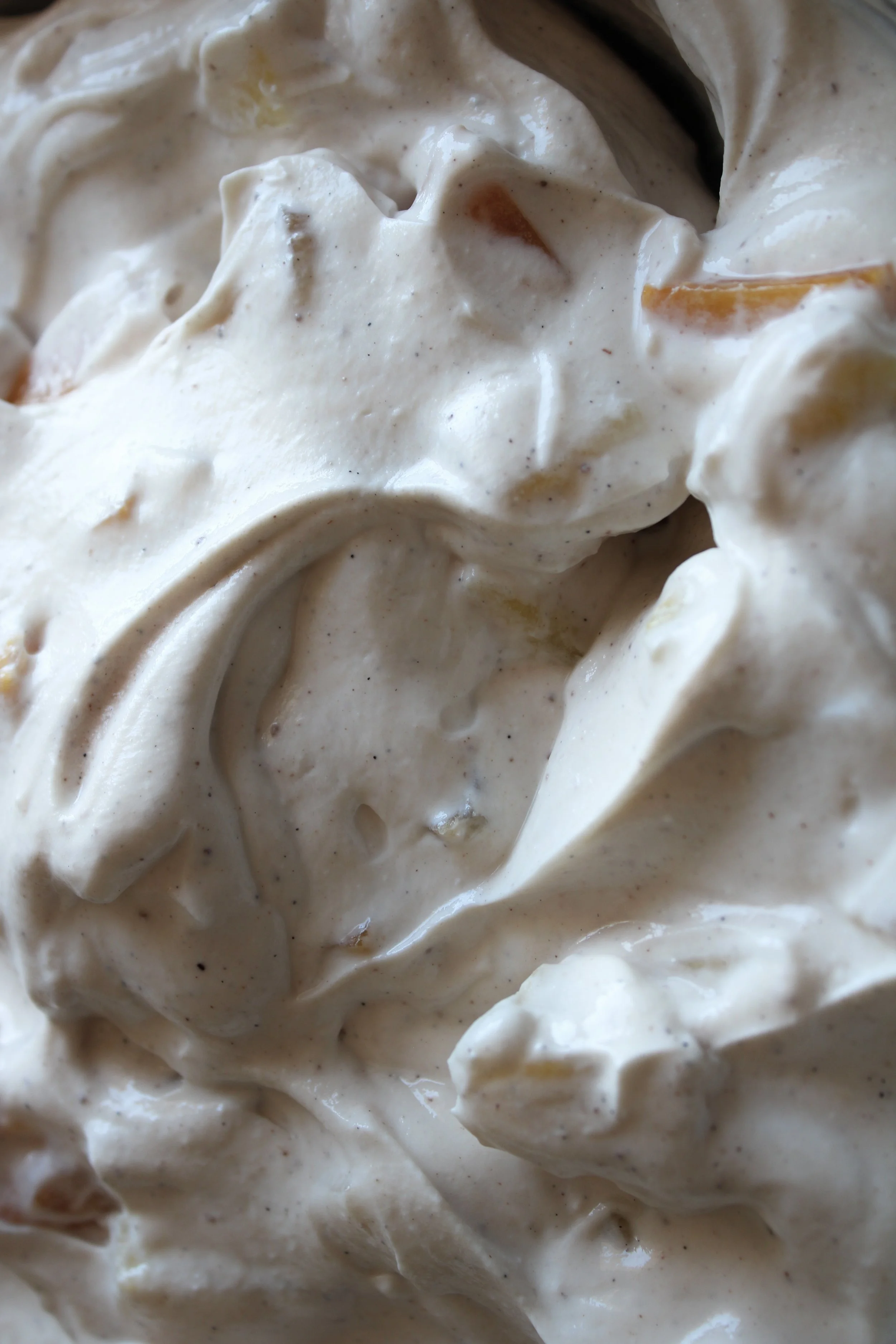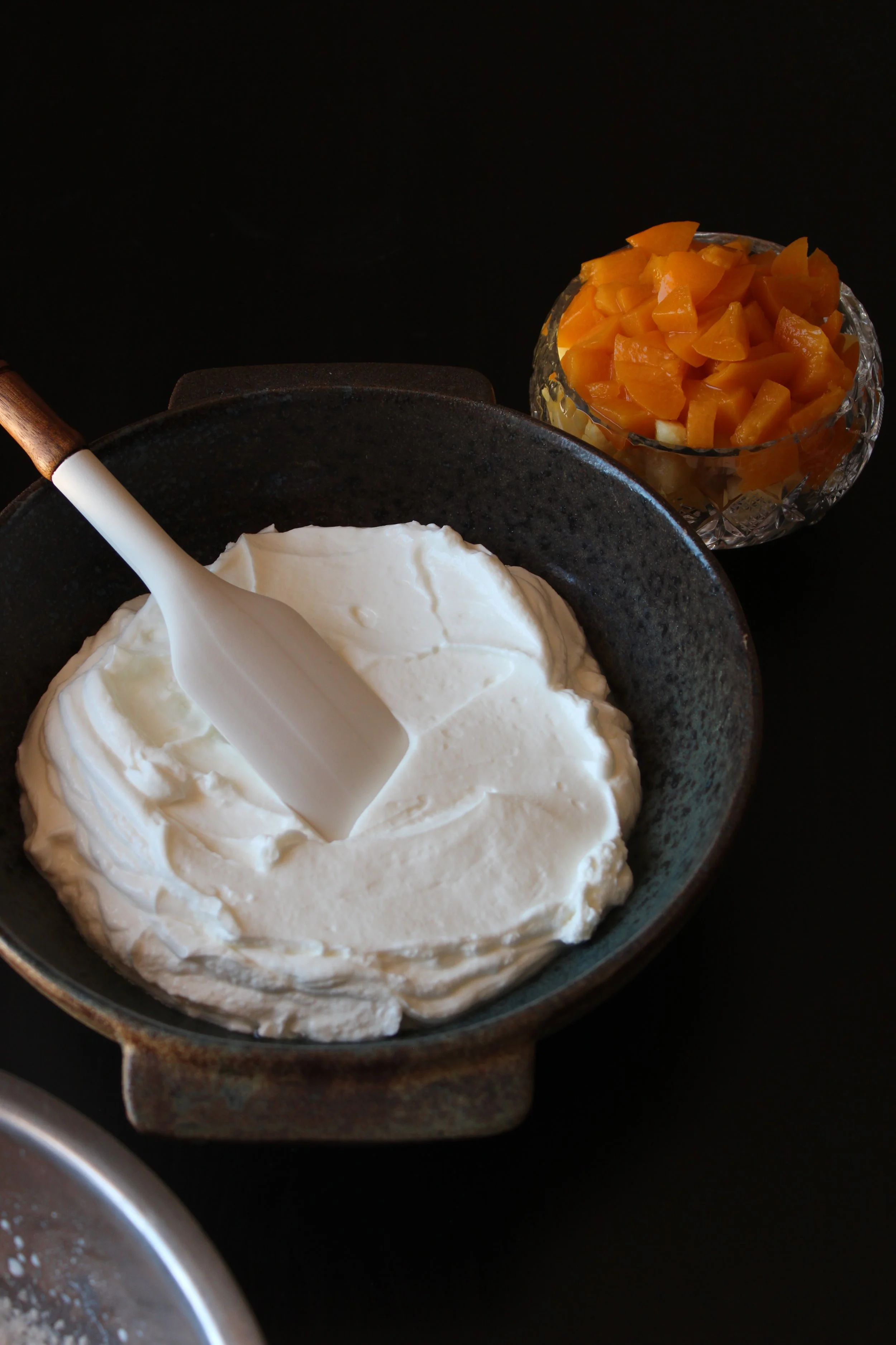 b.Add the well-drained fruit and mix carefully. The texture should be perfectly creamy and stable: when held on a spoon, the frugtsalat should hold its shape and remain firm, without falling.
